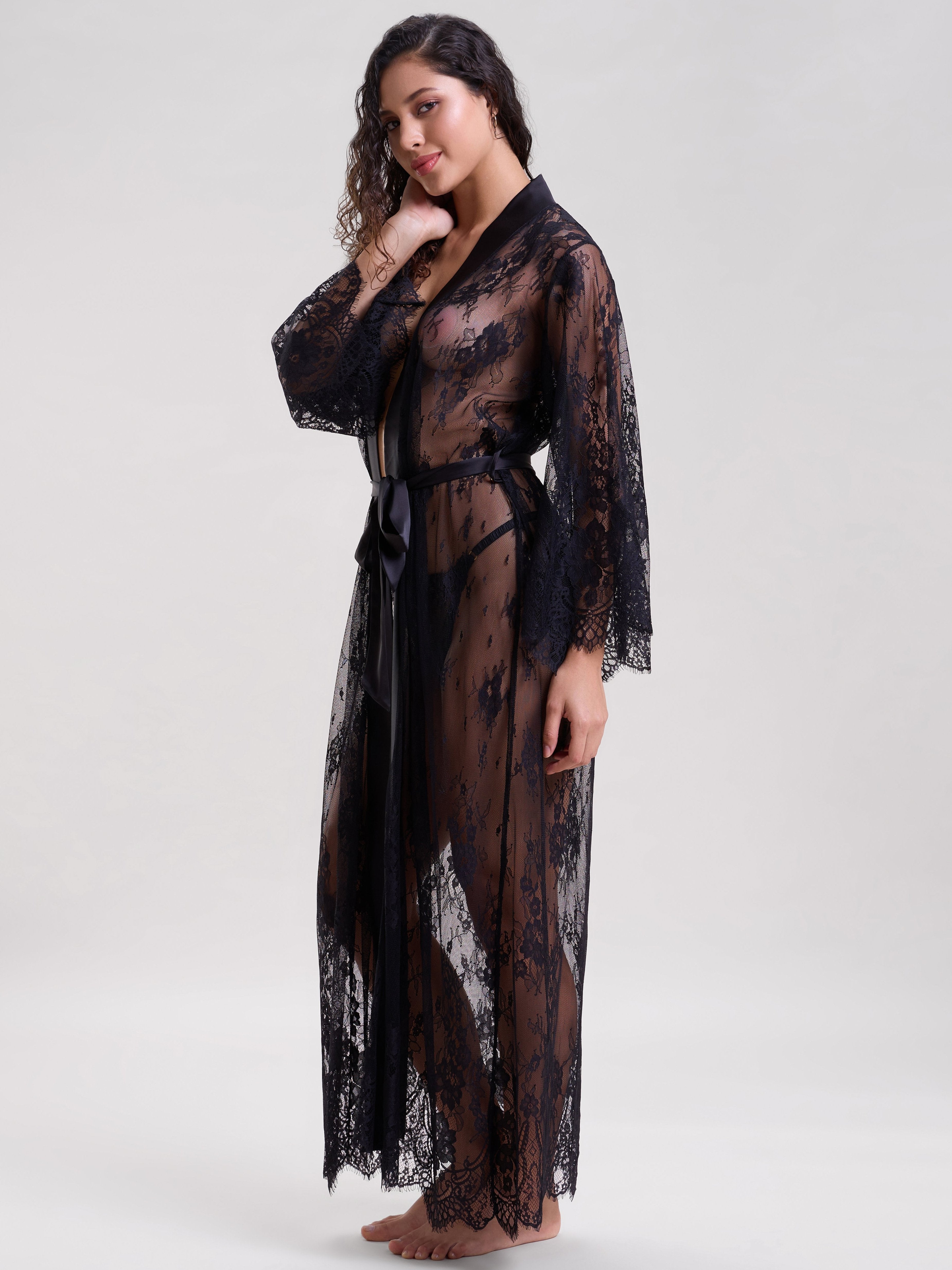 Wrap yourself in luxury with this full-length black Chantilly lace robe, crafted with exquisite fabrics and meticulous attention to detail in our ethical atelier. Soft and breathable, the intricate lace detailing adds a romantic, elegant touch. Perfect for lounging or adding a stylish layer to your nightwear for a flattering fit. Finished with our signature Mysthelle branded hardware, this robe brings both comfort and sophistication to your wardrobe.