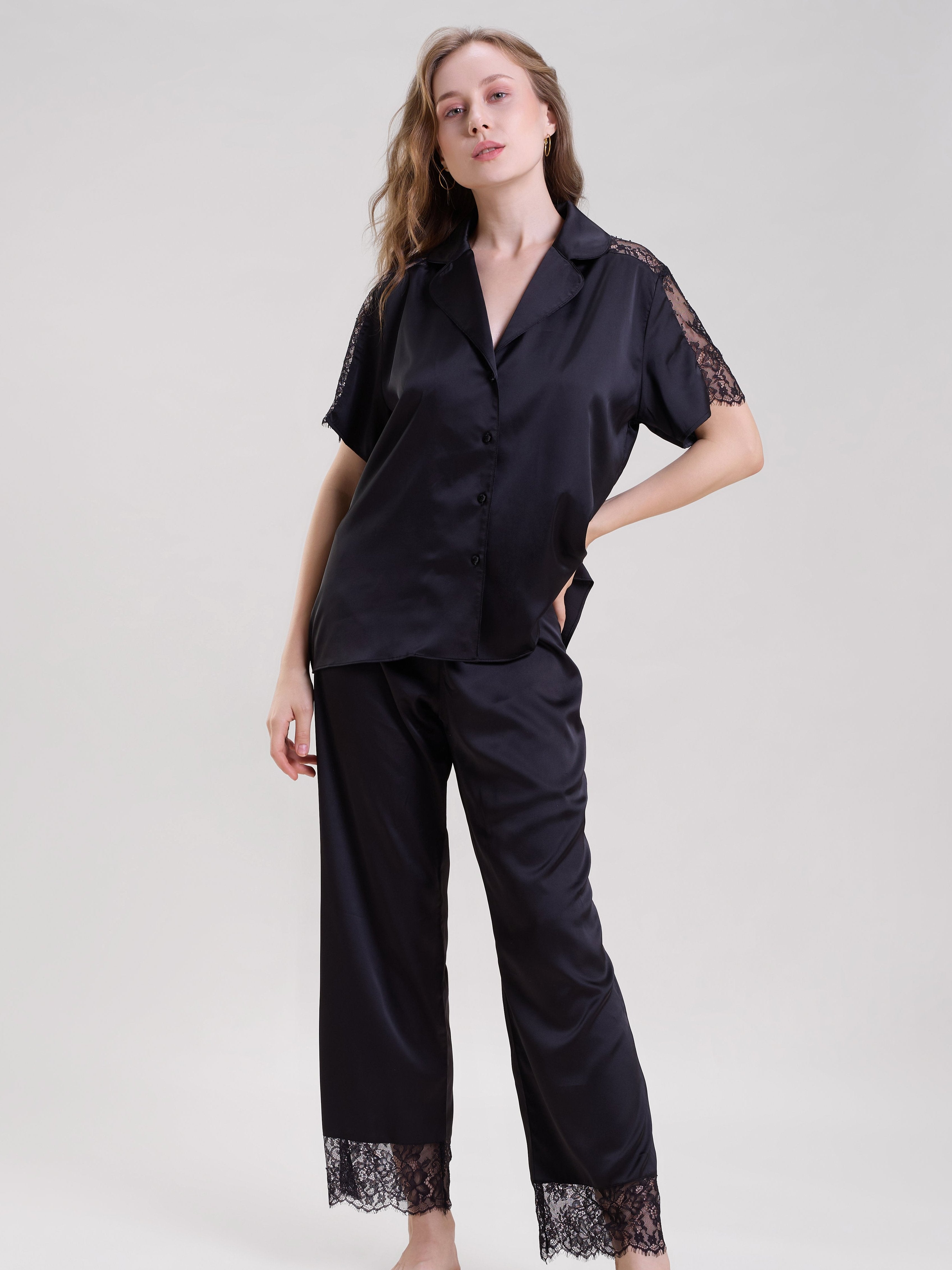 Embrace the elegance of this black satin shirt and pants set, designed to offer both style and comfort. Featuring Applique eyelash lace detailing. The button-up shirt with full sleeves gives a classic touch, while the elastic waistband on the pants ensures a perfect fit. Ideal for lounging or casual wear, this set is as chic as it is comfortable.