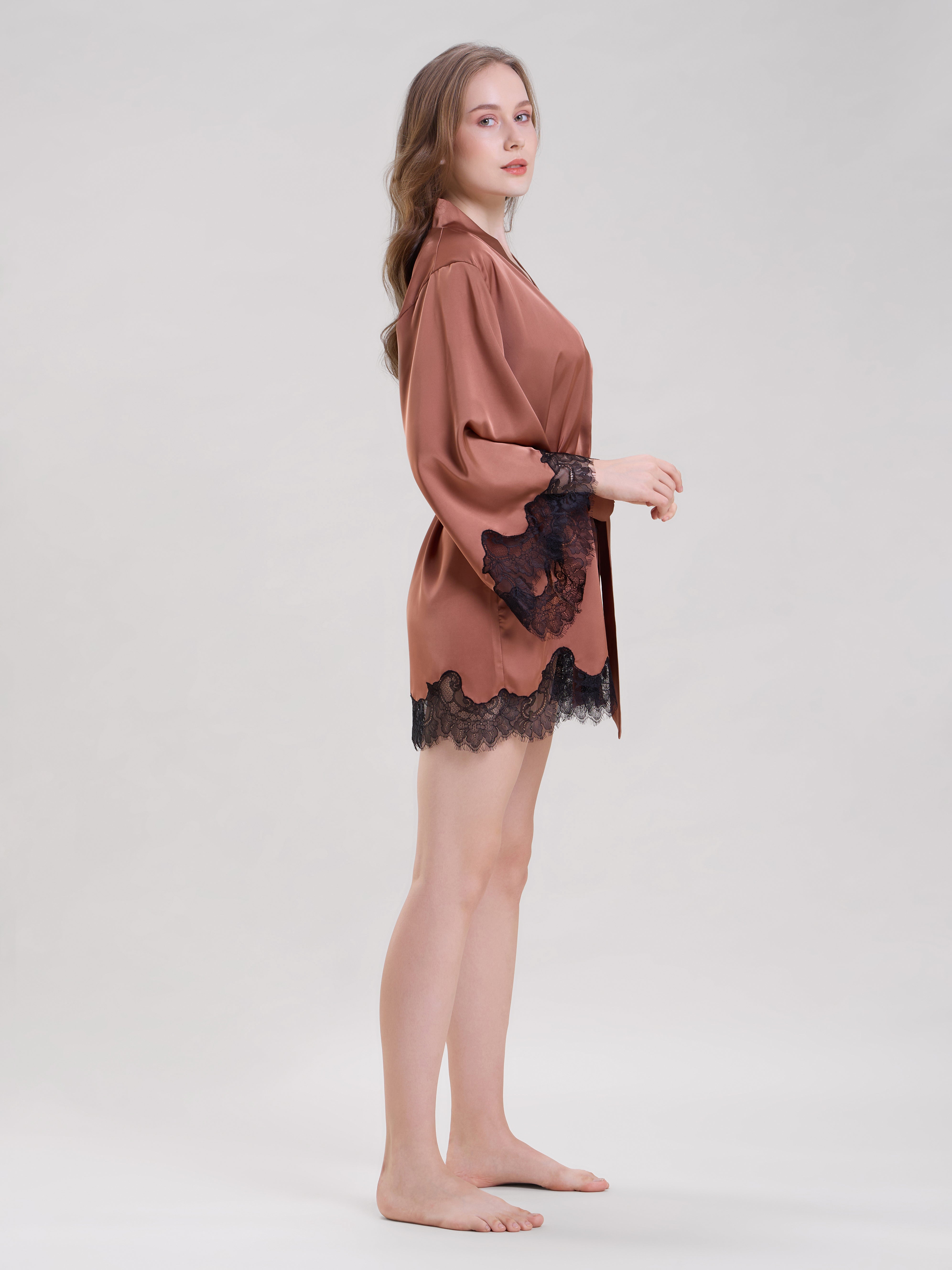 Elevate your loungewear with this bronze satin robe and matching cami top and shorts set. The short-length robe features black lace detailing and a satin tie belt for a custom fit. The cami top and shorts, adorned with eyelash lace and adjustable cross-back straps, offer chic comfort. Made ethically and finished with Mysthelle branded hardware, this set is perfect for lounging or special occasions.