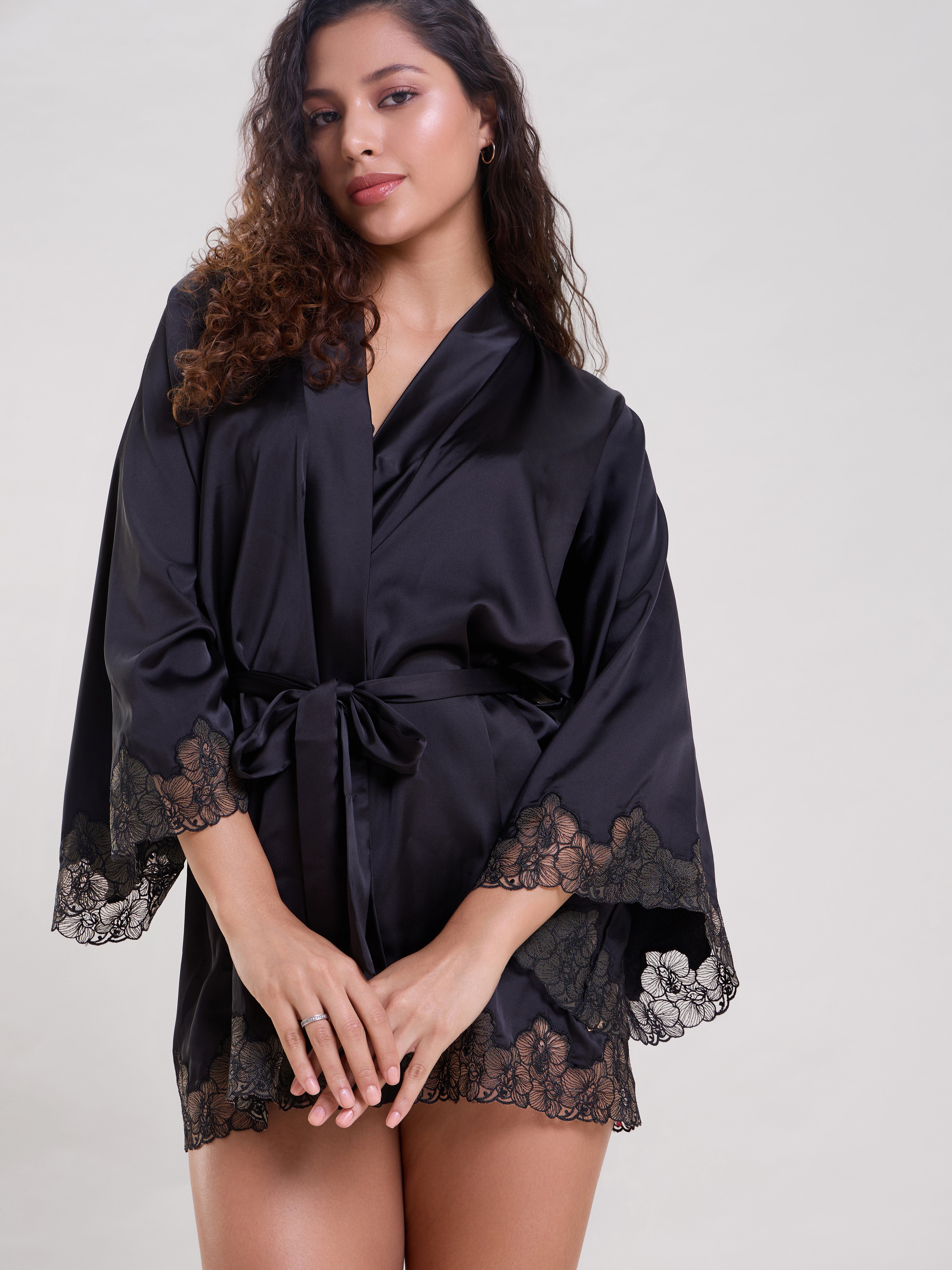 This sleek black satin robe combines comfort with a touch of sophistication, featuring floral embroidery on the sleeves for added style. Designed specially with luxury fabrics with great attention to detail and made ethically in our atelier. The above-the-knee length makes it perfect for lounging or as a chic layer to your nightwear. With a tie closure for an adjustable fit, this robe flatters all body types and adds effortless elegance to any occasion.