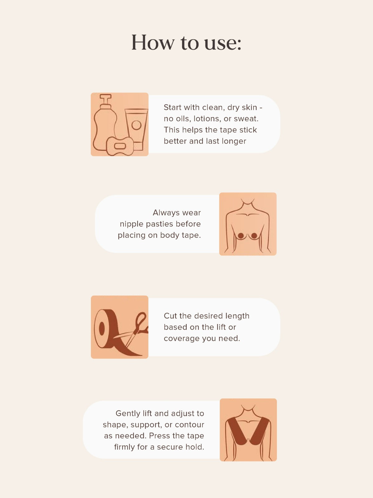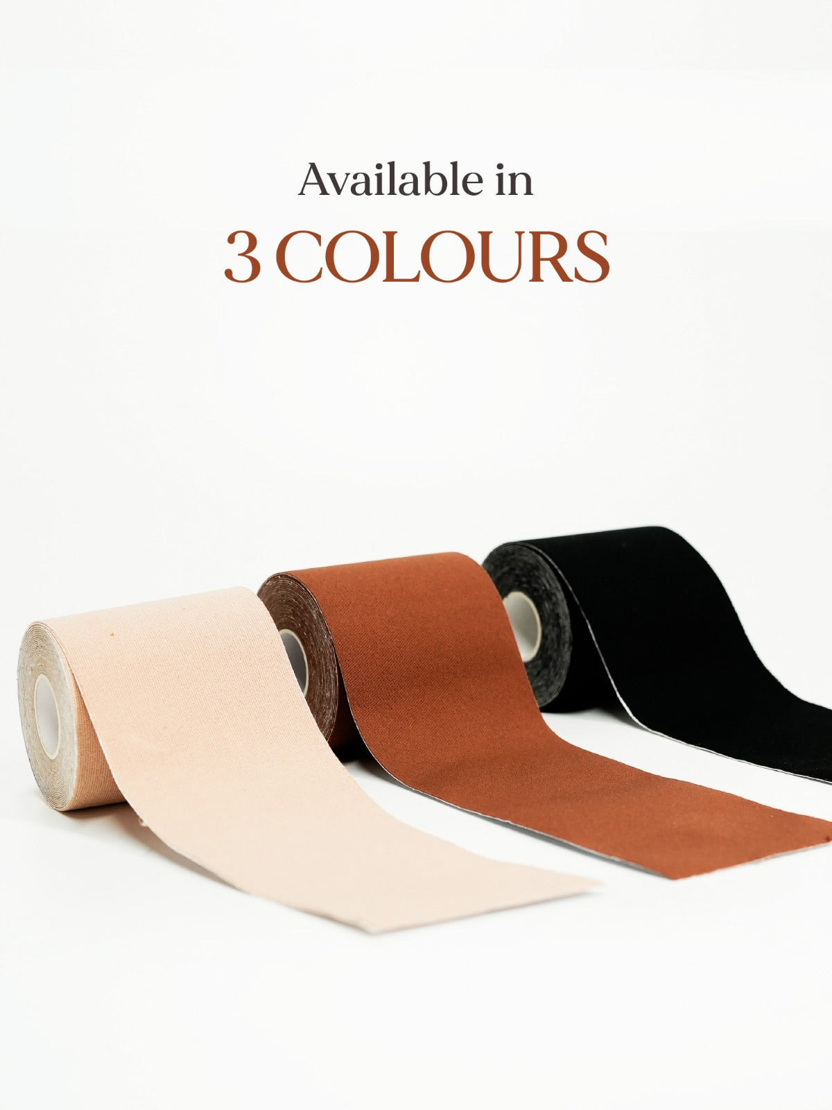 Say goodbye to wardrobe malfunctions with this ultra-adhesive yet gentle boob tape! Designed for all breast sizes, this tape provides invisible support under any outfit, creating the perfect cleavage for backless and strapless styles. It is skin-friendly which ensures a comfortable fit for sensitive skin. Use with nipple pasties and avoid applying to broken or irritated skin. Avoid overlapping to prevent irritation. Key Features: Suitable for all breast sizes Invisible under any outfit Creates perfect cleavage Stretchy, breathable, and skin-friendly Tape size: 7.5 cm X 5 meter roll Available in beige, brown, and black How To Use: To use boob tape, clean and dry your skin, apply nipple covers, and cut the tape to your desired length. Stick it under your breast and pull upwards for lift or inward for cleavage. Smooth as you go. For removal, use warm water or oil to loosen the adhesive and peel off gently. Avoid using on broken skin and wear for no more than 6–8 hours.