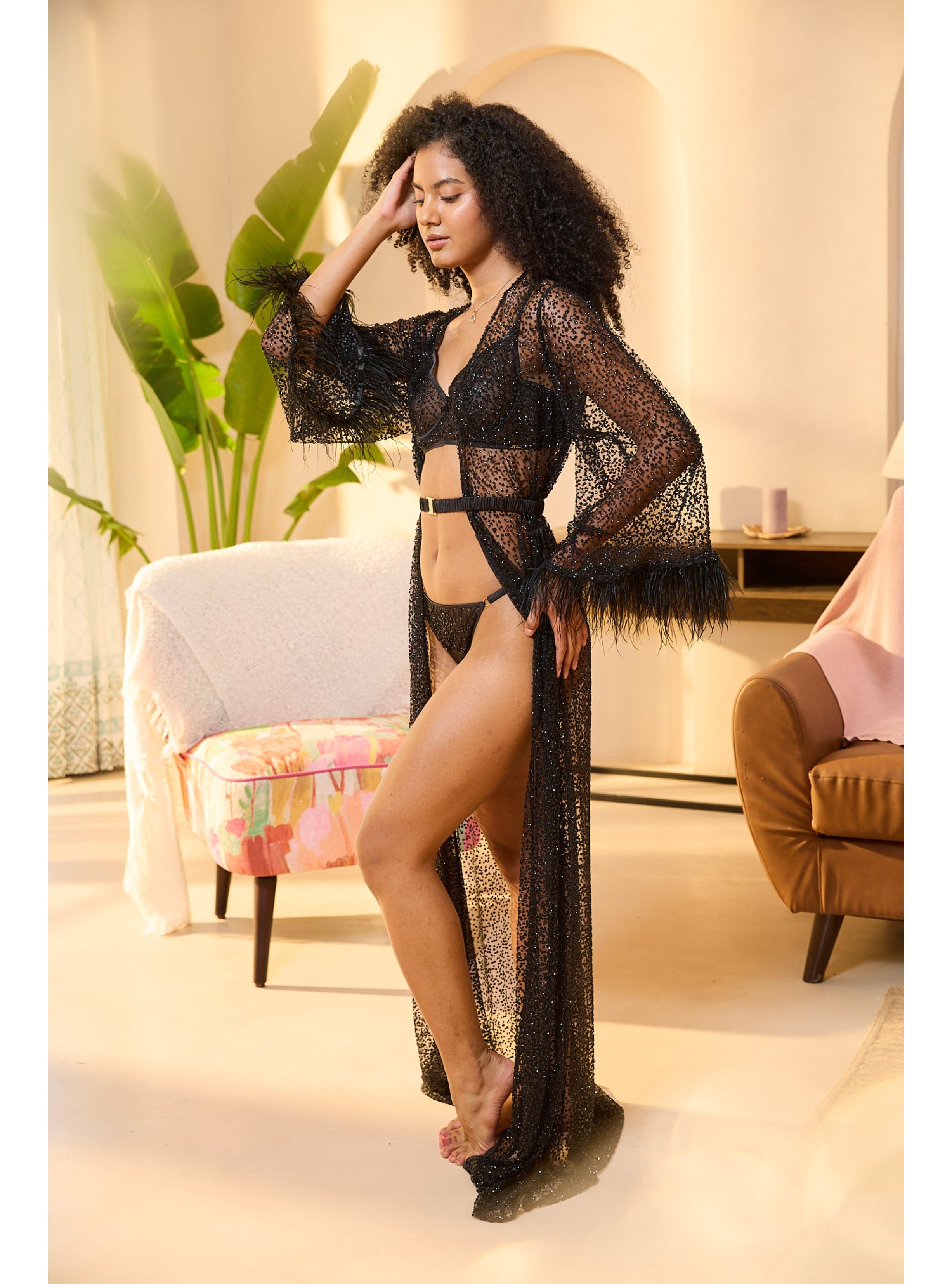 Elevate your elegance with this stunning Black Embellished Robe and Lingerie Set. Perfect for special occasions, this set includes a luxuriously embellished bra and thong, paired with a flowing full-length robe. The robe features hand-beaded tulle, feathered cuffs, and a belted waist for a custom fit. Together, this ensemble exudes refined glamour, making you feel extraordinary whether for a wedding, honeymoon, or an unforgettable event. Ethically crafted in our atelier, it’s finished with exclusive Mysthelle branded hardware for a touch of distinction.