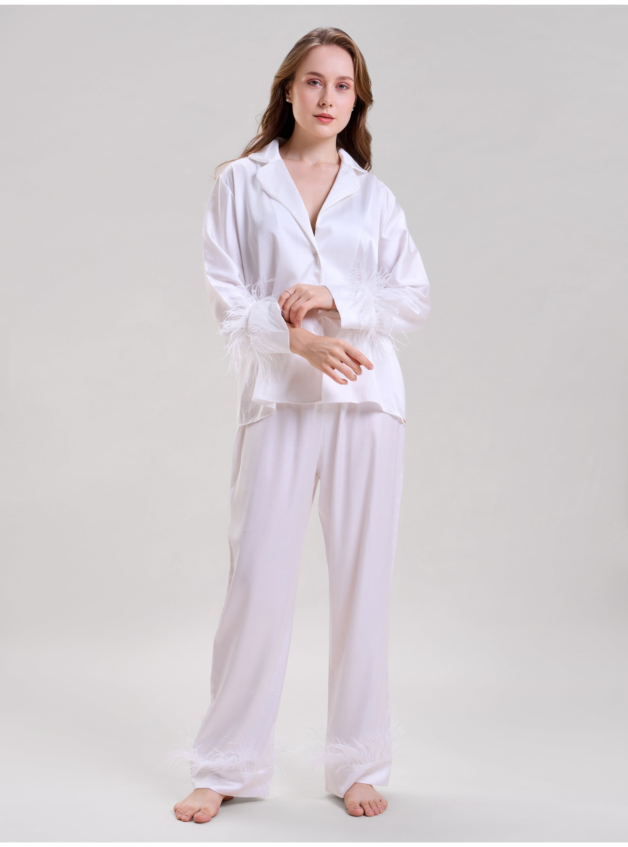 Experience luxury with this sleek Pearl White Satin Nightsuit Set. Crafted from handpicked luxury satin fabric and premium feathers. The matching button-down shirt and elasticized pajama pants offer ultimate comfort. This set is effortlessly glamorous, making it perfect for lounging in style or a luxurious night's sleep. Ethically made in our atelier and finished with our special Mysthelle branded hardware.