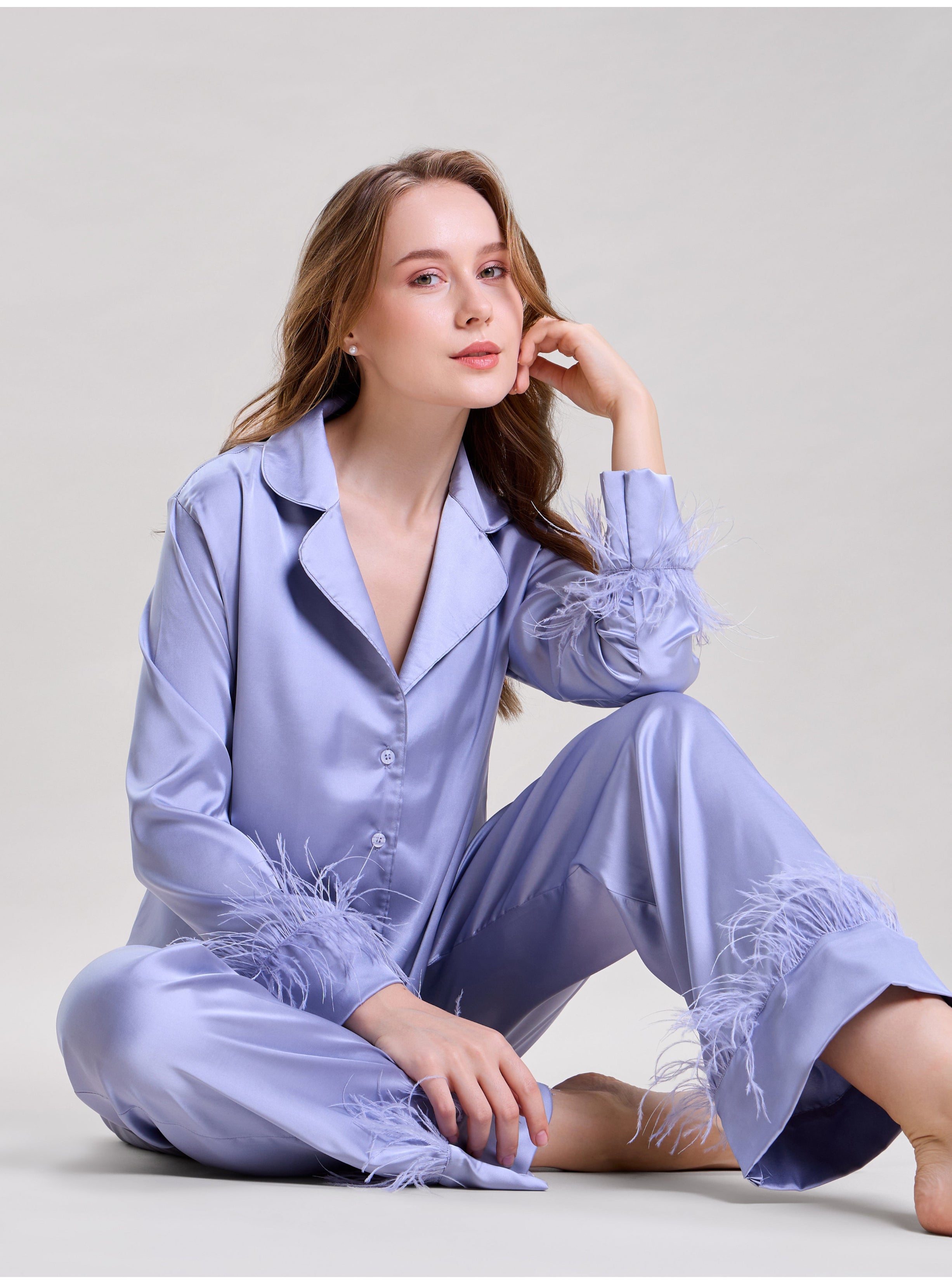 Elevate your loungewear with this sleek Tiffany Blue Satin Nightsuit Set. Crafted from handpicked luxury satin fabric and premium feathers. The matching button-down shirt and elasticized pyjama pants offer ultimate comfort. This set is effortlessly glamorous, making it perfect for lounging in style or a luxurious night's sleep. Ethically made in our atelier and finished with our special Mysthelle branded hardware.